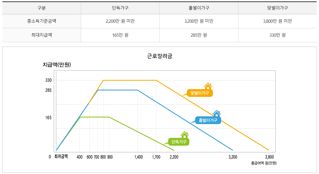 근로장려금은 가구원 구성에 따라 정해진 부부합산 총급여액 등을 기준으로 지급액을 산정한다.
