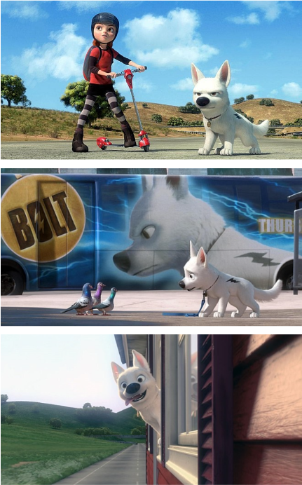 그 장면을 본 볼트는 페니가 자신을 잊고 새로운 강아지를 데리고 왔다고 착각하고는 힘없이 돌아서 가는데 촬영장에 불이 나게 된다. 불이 난 것을 본 볼트는 페니를 구하기 위해 다시 건물 안으로 달려가고 페니와 극적으로 다시 만나 탈출을 시도한다. 하지만 막다른 곳에 갇히고 페니는 쓰러진다. 그때 볼트는 긴 환풍기를 향해 슈퍼 짖기를 하고 그 소리는 울려 바깥까지 들리게 되면서 페니를 구하게 된다. 그렇게 다시 만나게 된 볼트와 페니는 고양이 그리고 햄스터와 함께 한집에서 평범한 삶을 지내게 된다. 오늘은 멋진 강아지 볼트가 나오는 영화를 추천해 본다.