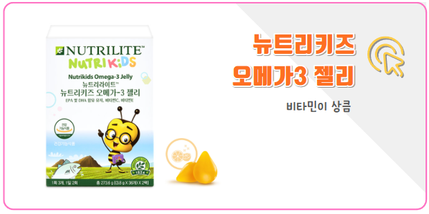 아이들이 더 맛있고 건강하게 먹을 수 있도록 뉴트리키즈 오메가-3 젤리를 "건강기능식품"으로 출시하였다. EPA & DHA는 물론 비타민 C와 비타민 E를 더해 완성하였다.