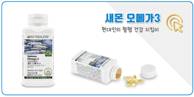 뉴트리라이트 새몬 오메가3는 일상생활에서 부족하기 쉬운 EPA 및 DHA 함유 유지를 보충해 주는 제품이다. 차가운 심해에서 잡은 연어와 정제어유를 주원료로 추출한 EPA 및 DHA 함유 유지와 함께 유통기간 중에 자칫 산화될 수 있는 EPA 및 DHA 함유 유지를 더 철저하게 보호하기 위해 비타민 E가 함유되어 있다. EPA 및 DHA 함유 유지는 혈중 중성지질 개선 · 혈행 개선에 도움을 줄 수 있다.