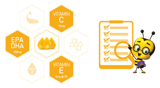 성장기 어린이 권장 섭취량에 맞춰 EPA 및 DHA 550 mg, 비타민 C 74 mg, 비타민 E 5 mg을 설계하였다.