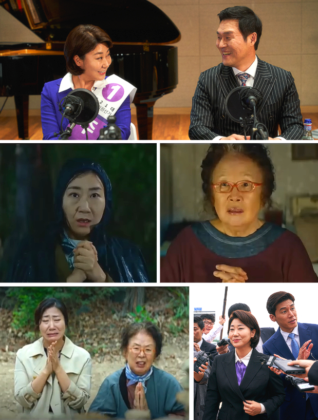 2020년 2월 12일 개봉 / 생활 속에 거짓말이 녹아 있는 3선 국회의원 주상숙(라미란)은 자신의 할머니 옥희(나문희)가 암 투병 중에 전 재산을 대학에 기부한 것을 이용하여 재단을 설립한다. 옥희 할머니가 상숙이 선거 중에 돌아가셨다는 애매한 보도가 나가자 오히려 이미지가 좋아져 돌아가신 것으로 못을 박아버리고 할머니는 어쩔 수 없이 숨어 살게 된다. 상숙은 럭셔리한 멀쩡한 자신의 집을 두고 오래된 아파트에 살면서 검소한 생활을 연기하며 지내고 있다. 상숙은 고위층들과 각종 비리에 연루되어 국민을 진정으로 생각하는 정치인이기보다는 표를 얻기 위한 데 더 전념한다. 표를 얻기 위해서라면 금실 좋은 부부연기도 마다하지 않고 반짝이는 높은 구두도 낮은 구두로 갈아 신고 그마저도 낡아 보이지 않는다는 이유로 살짝 밟아 주는 보좌관(김무열)까지 호흡이 잘 맞는 것 같다. 어느 날 과학 도시화에 대해 집중 토론을 진행하는 중 상대 후보 남용성이 아들의 이중 국정과 옥희 할머니재단에 대한 비리를 들먹이는 듯하지만 실상은 서로 짜고 진행하는 이마저도 연기였다. 상숙은 집권당 대표라는 든든한 빽이 있었다. 대표와 남용성 주상숙 이렇게 세 사람이 몰래 만나 비리를 나누는 장면을 파파라치가 설치해 둔 카메라에 고스란히 찍히고 있었다. 다행히 대표의 대처로 BMW와 영상을 맞교환하면서 해결한다. 어느 밤 깊은 산 속 숨어 지내던 상숙의 할머니를 찾아갔다가 야단만 맞고 돌아내려오던 길 천둥우속에 보좌관이 우산을 가지러 가고 앞에 있는 돌탑을 발견한 상숙은 알 수 없는 이끌림에 돌을 하나 집어 올리고 4선에 꼭 되게 해달라고 빌게 되고 같은 시간 옥희 할머니도 물 떠 놓고 상숙이 거짓말하지 않고 살게 해달라고 간절하게 소원을 빈다. 그 순간 벼락이 치고 상숙이 올린 돌탑을 무너트린다.